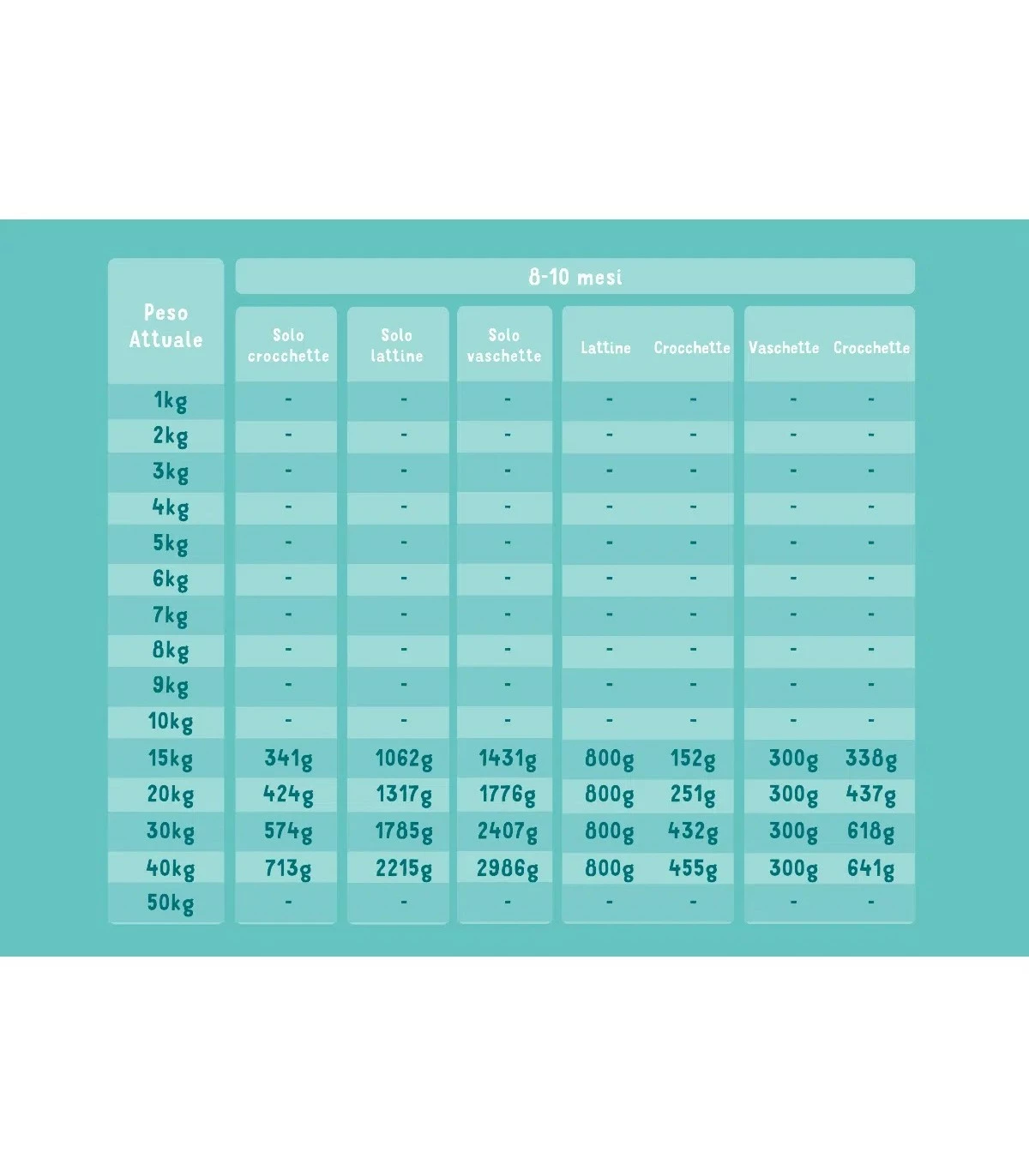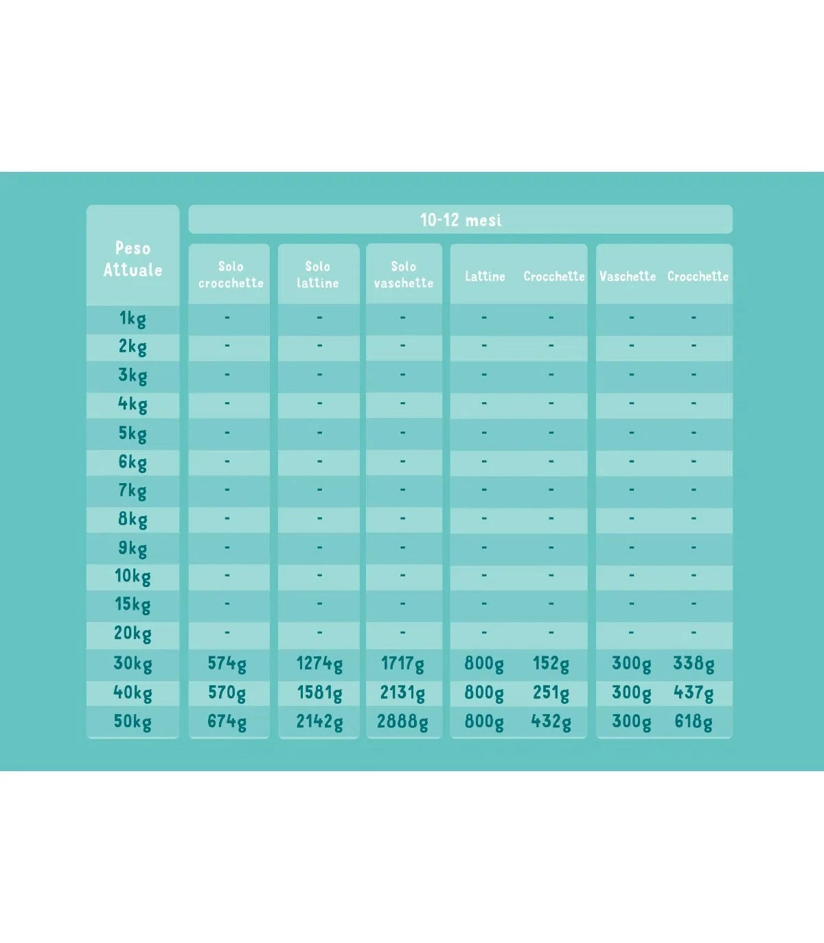 Vedi tabelle nelle immagini. Troverai indicazioni di dosaggio per cuccioli da 0 a 12 mesi d’età.
