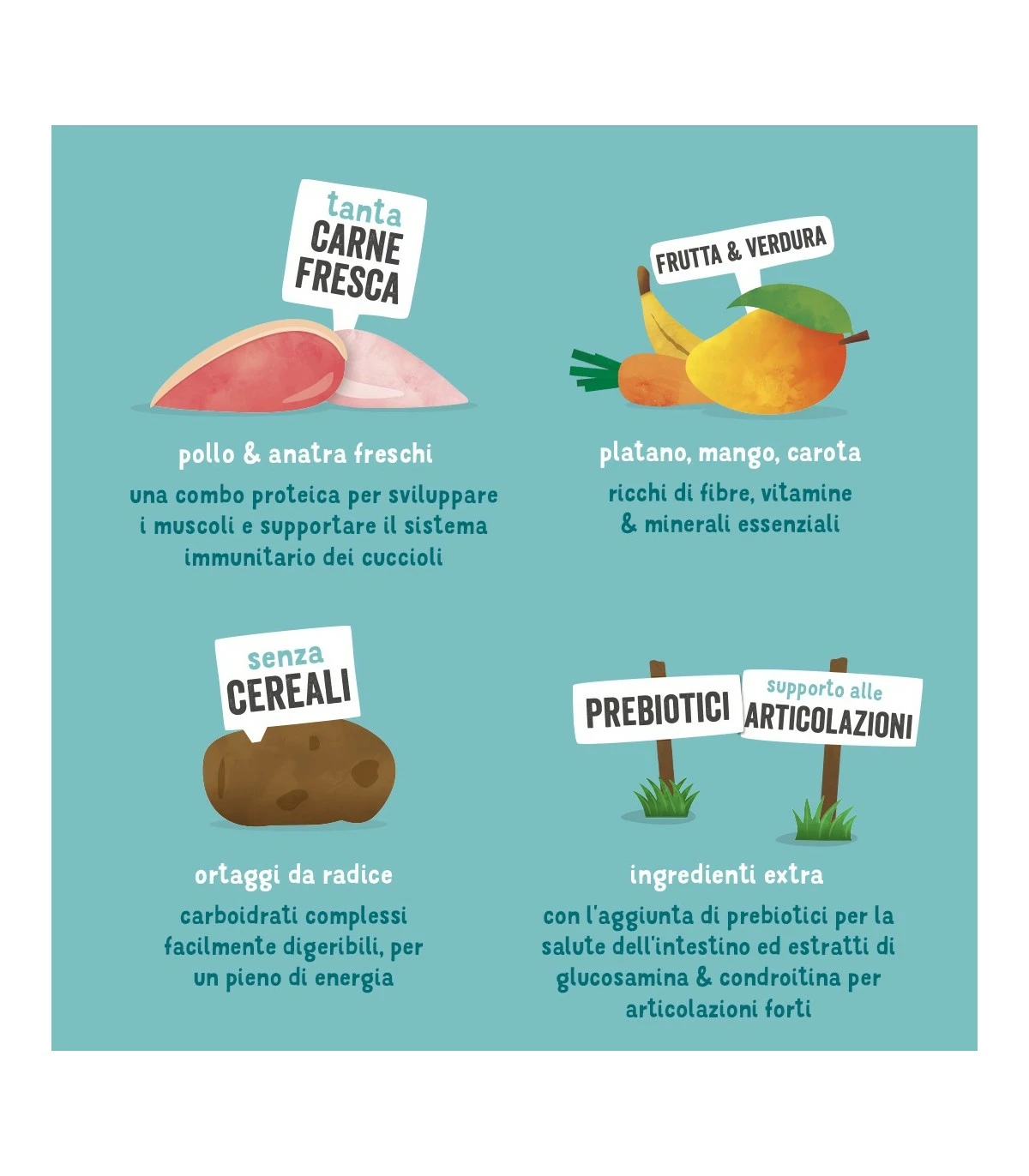 pollo fresco 40%, patate 20%, anatra fresca 10%, piselli 8%, proteina di piselli, proteina di patate, sughetto di pollo, semi di lino, grasso di pollame, minerali, olio di pesce, zucca 0,25%, platano 0,25%, mango 0,25%, mannanoligosaccaridi (MOS), cicoria, erbe 0,2% (fiori di calendula, ortica, foglie di rovo, finocchio, cumino dei prati, camomilla, melissa), carote 0,13%, mirtilli rossi comuni 0,13%, glucosamina, solfato di condroitina.