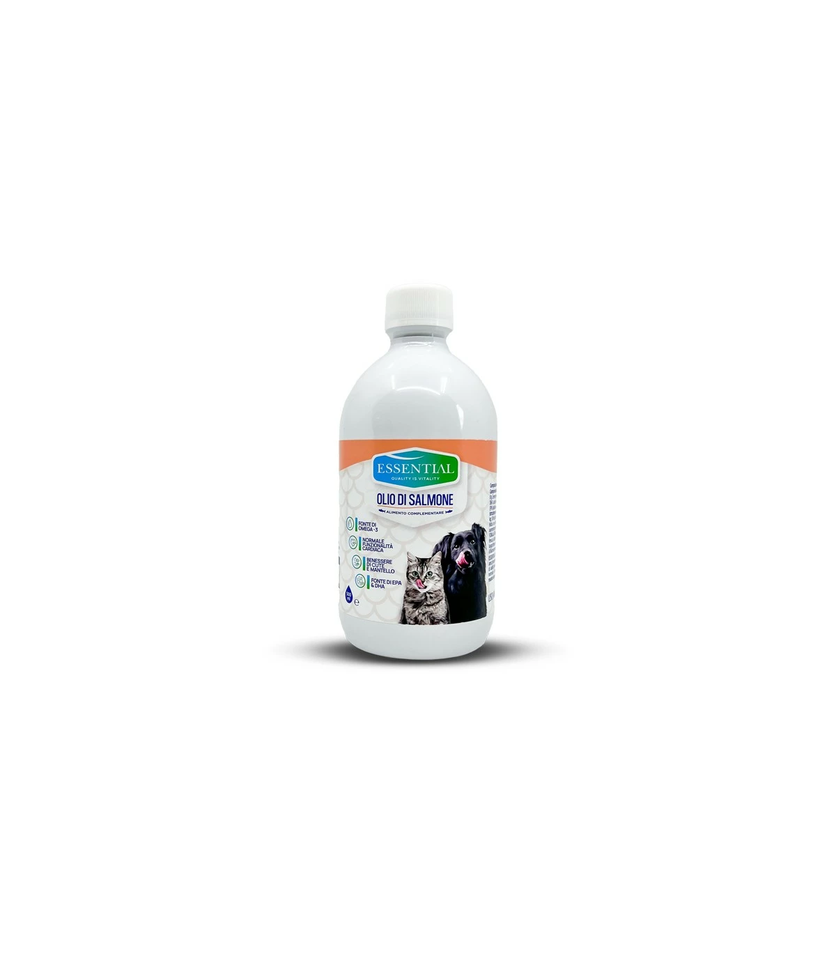 ESSENTIAL Olio di Salmone è un alimento complementare ideale come arricchimento nell’alimentazione del cane e del gatto. È naturalmente ricco di acidi grassi Omega 3, nutrienti utili al benessere dell’organismo, al normale funzionamento del sistema immunitario e preziosi per un manto lucente e per il benessere della cute.Â