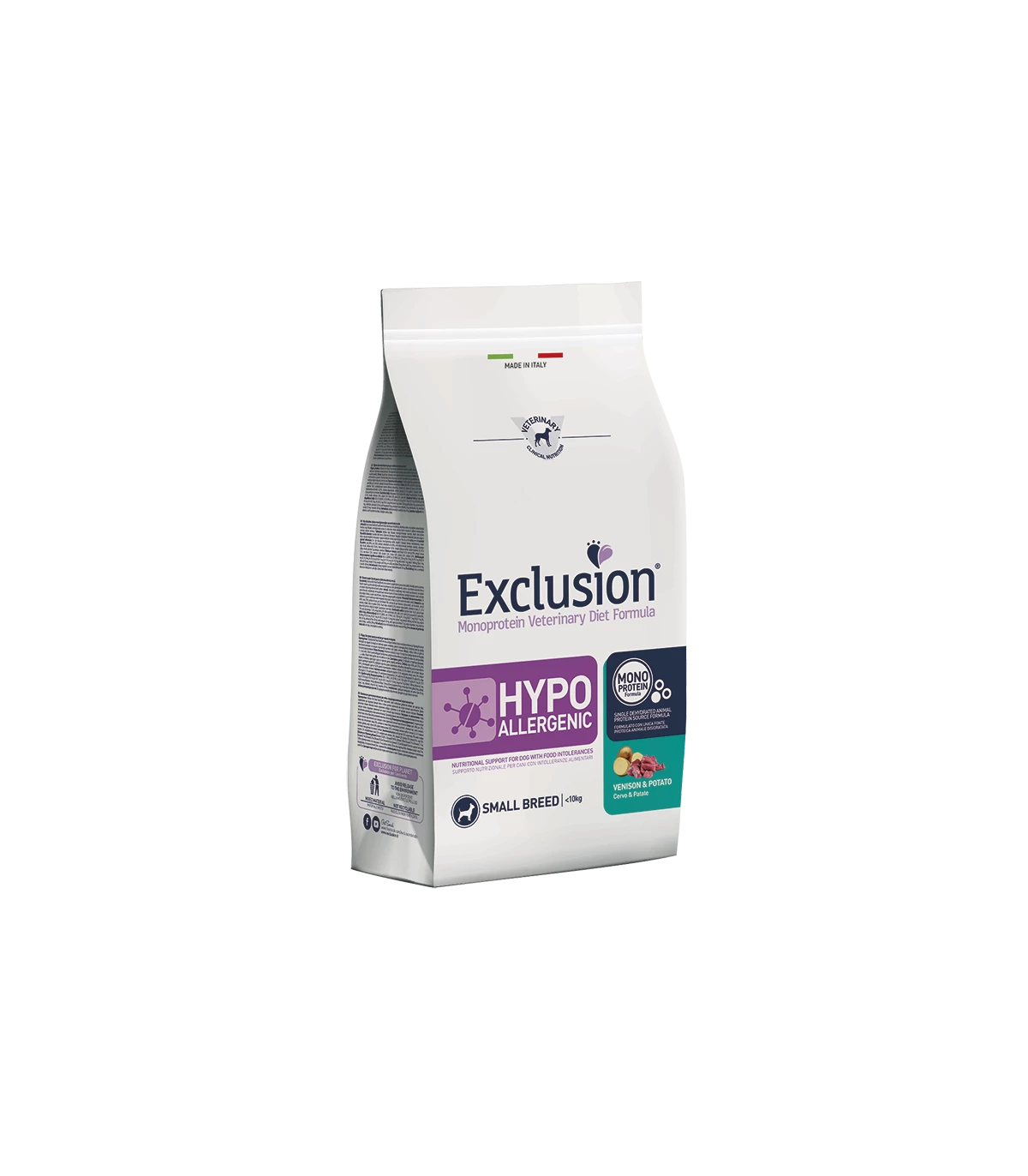 Exclusion Monoprotein Veterinary Diet Formula Hypoallergenic è un alimento dietetico con formulazione monoproteica, realizzato con un’unica fonte alternativa di proteine animali, ingredienti innovativi e preservato con tocoferoli naturali; rappresenta la risposta nutrizionale a disposizione del Veterinario, differenziata per taglia, come supporto nutrizionale per cani con intolleranze alimentari.