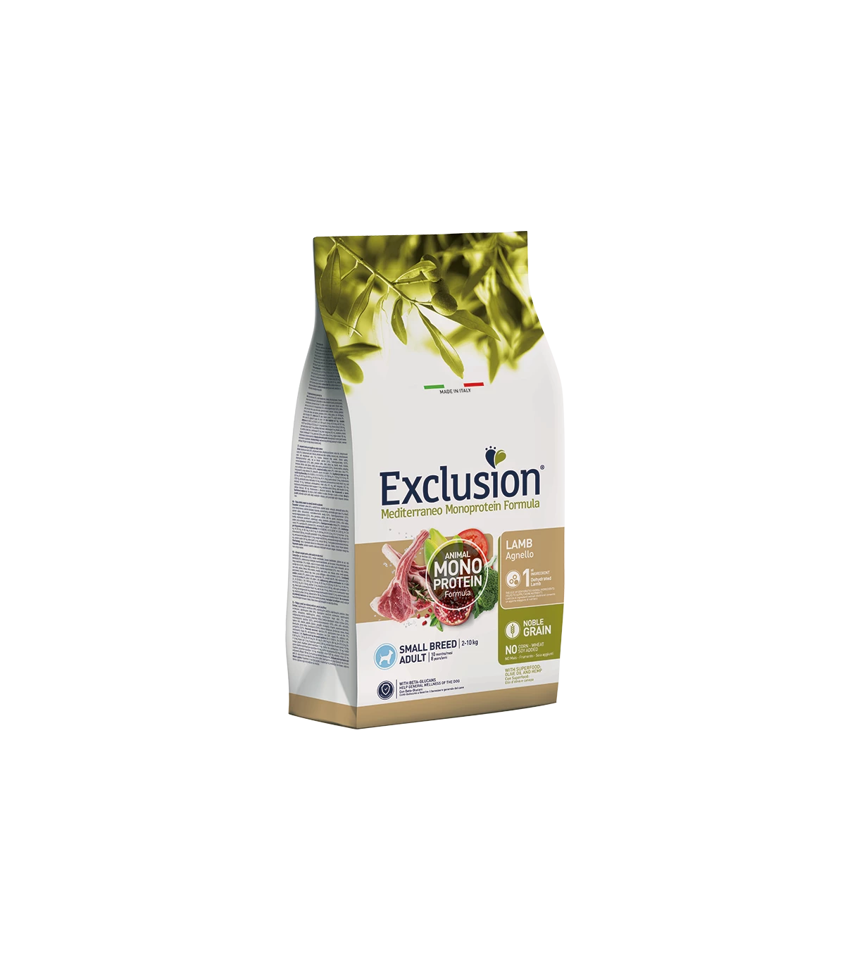 Exclusion Mediterraneo Monoprotein Formula – Noble Grain é un alimento completo e bilanciato formulato con una sola fonte proteica animale disidratata, per una ricetta chiara ed essenziale, e solo un cereale nobile di alta qualità. È preservato con antiossidanti naturali e integrato con Beta-glucani. È realizzato con una innovativa ricetta di Superfood della tradizione Mediterranea: Canapa, Olio d’Oliva, Pomodoro, Melagrana, Broccolo e Cicoria. Senza grasso di pollo, frumento, soia e mais aggiunti.