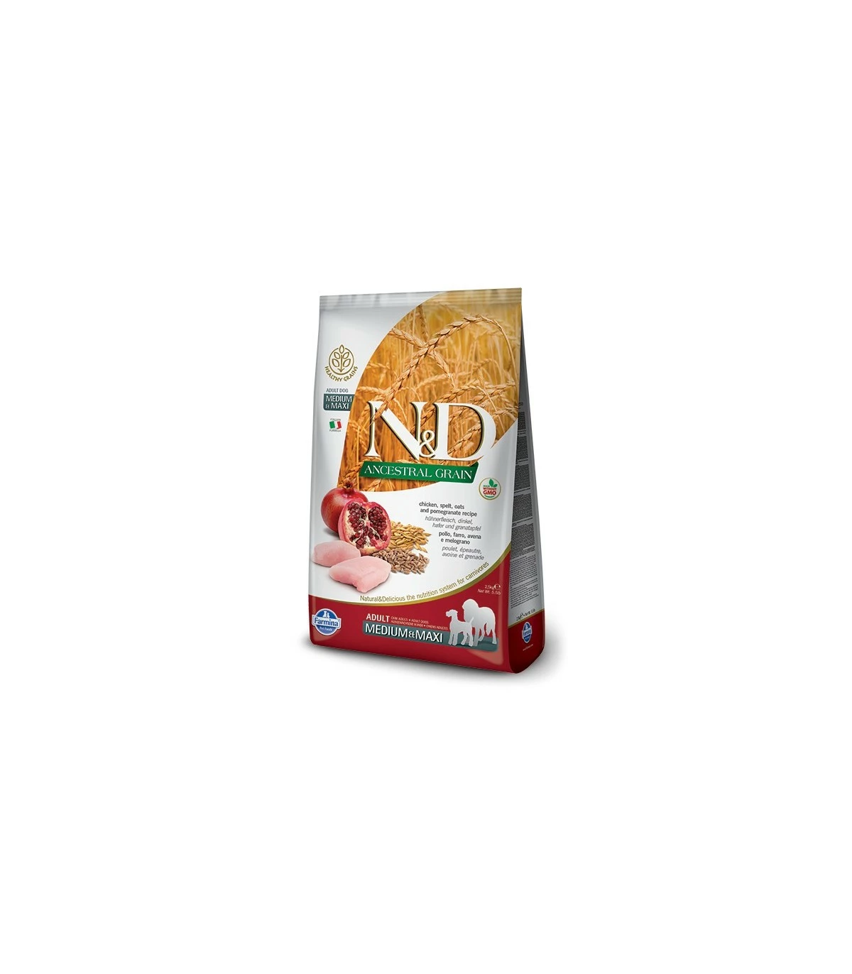 Farmina n&d low grain cane medium & maxi farro avena pollo e melograno 12 kg è un alimento completo per cani adulti a base di farro, avena, pollo, melograno