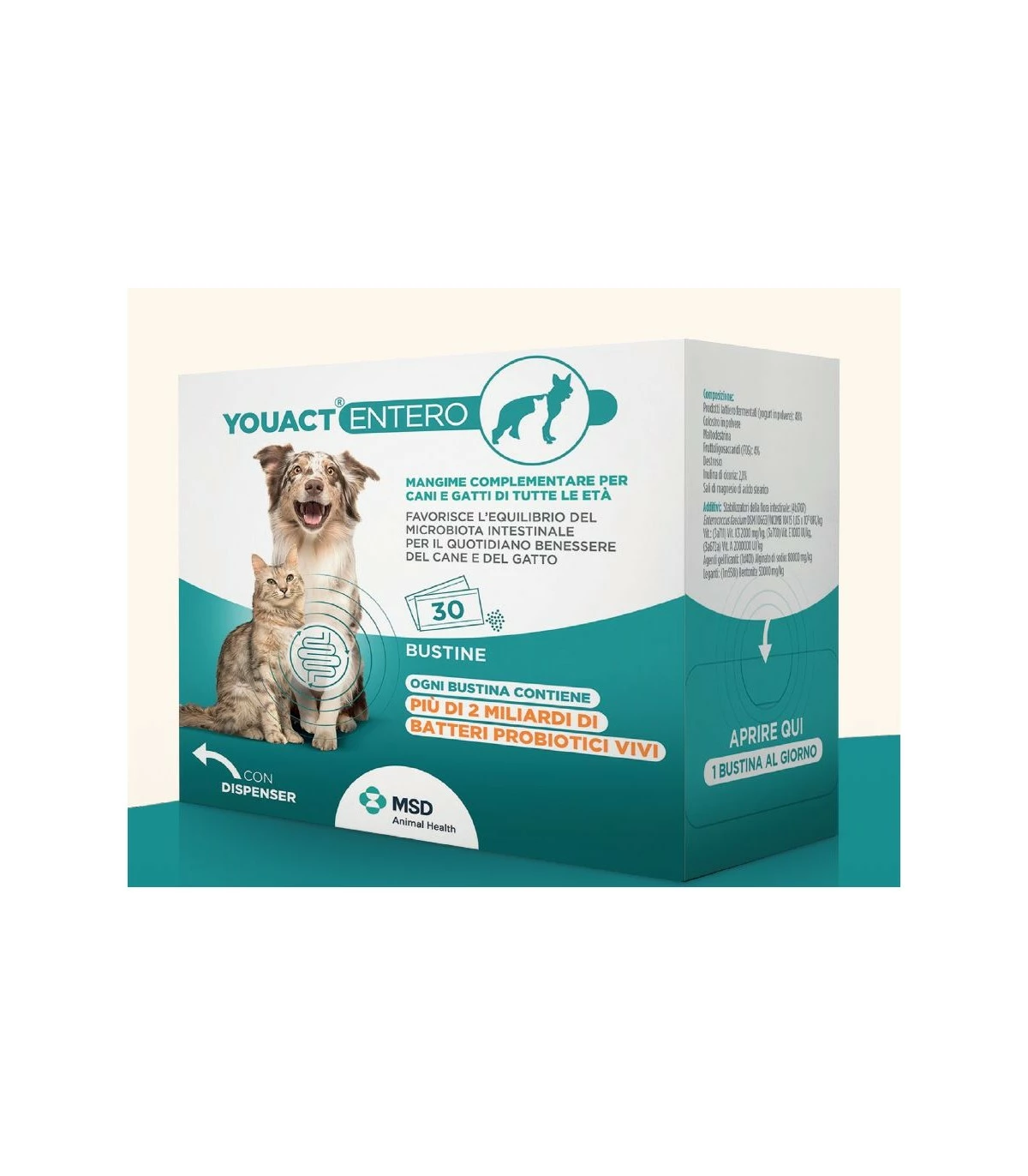 YOUACT® ENTERO è un mangime complementare riequilibrante del microbiota intestinale di cani e gatti. È indicato in caso di trattamento e prevenzione di disbiosi dovute a Cambi di dieta o diete non bilanciate, Terapie antibiotiche prolungate, Enteropatie idiopatiche (razza), Stress intestinali di varia natura (parassitosi, allergie).
