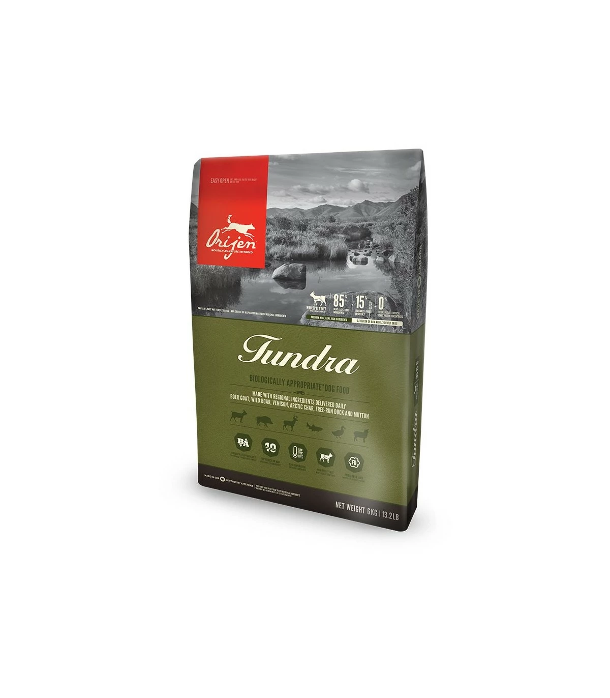 Orijen cane tundra 11,4 kg sono biologicamente appropriati per tutte le fasi della vita. Capra, cinghiale, cervo, salmerino alpino, anatra allevata a terra e montone freschi per via della loro evoluzione, i cani crescono al meglio con una dieta varia a base di cacciagione, pesce e volatili selvatici interi, con piccole quantità di frutta, verdura e erbe.