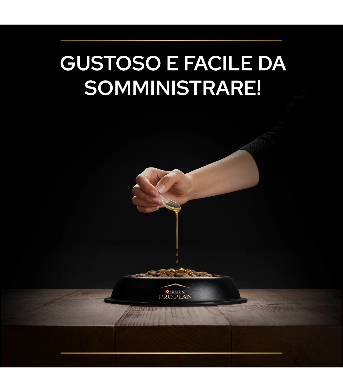 Pro Plan Supplements Skin & Coat + è un alimento complementare per cani adulti di tutte le taglie che nutre la pelle e il pelo del tuo cane in modo completo perché contiene nutrienti essenziali come gli acidi grassi Omega-3 e Omega-6 provenienti da salmone Norvegese, olio di semi di lino e vitamina E.
