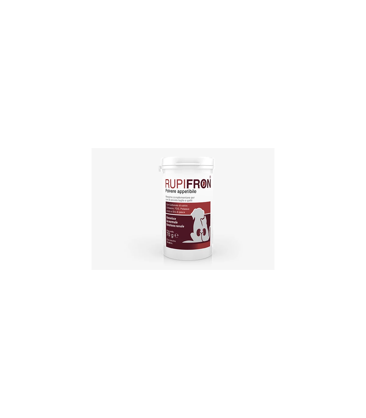 Somministrare RUPIFRON® POLVERE APPETIBILE miscelata nel cibo gradito. Completare la razione giornaliera con l’alimento abituale. Lasciare sempre acqua fresca a disposizione. Fino a 5 kg: 1 misurino (500 mg), 5-10 kg: 2 misurini (1000 mg).