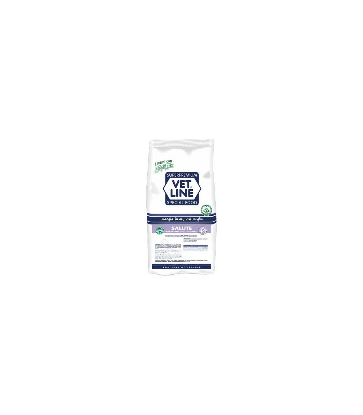 Composizione: Carne di cervo disidratata 18%, riso, patate, piselli, favino, olii e grassi, semi di lino (3%), polpa di barbabietola essiccata, olio di pesce, erbe officinali (Lino, Ortica folia, Acerola, Tarassaco, Uncaria Tomentosa, Santoreggia, Timo, Fucus, Aglio), sostanze minerali.